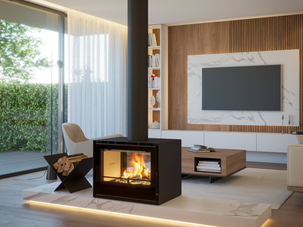 Dupla Face appliances feature dual fire views with panoramic serigraphed glass fronts and a modern design that adapts to any type of environment. Silent ventilation system, high power and low consumption (of firewood).