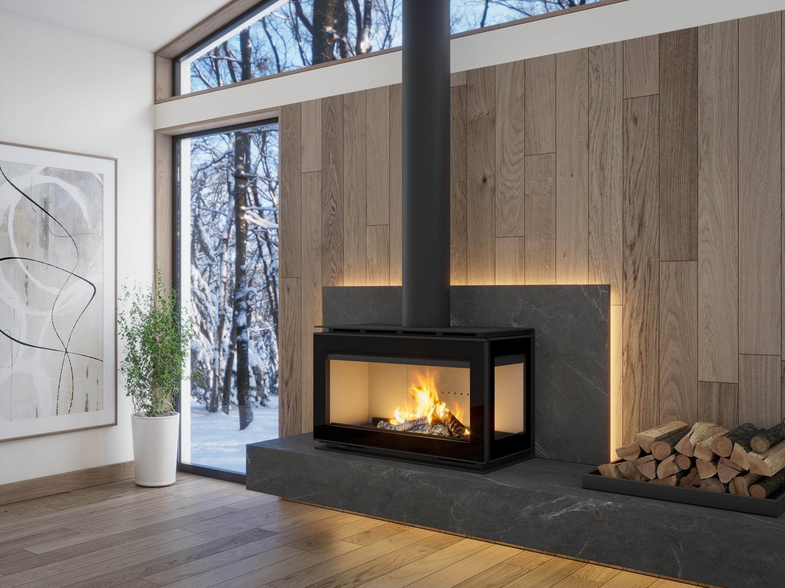 Os equipamentos Dupla Face possuem dupla visão de fogo com frentes panorâmicas em vidro serigrafado e um design moderno que se adapta a qualquer tipo de ambiente. Sistema de ventilação silencioso, de elevada potência e baixo consumo (de lenha).